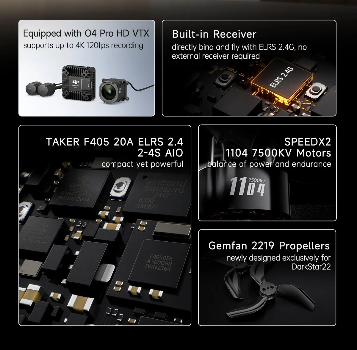 The DarkStar22 combines high performance with portability, equipped with the DJI O4 Pro VTX system, delivering ultra-low latency, HD stable long-range transmission.