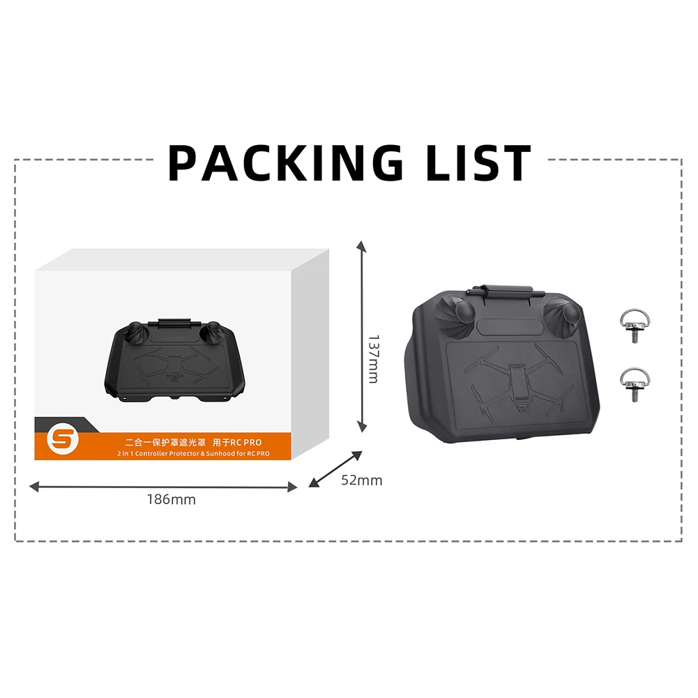 Features: 1. Unique Design: The unique two-in-one design is not only a protective cover, but also a light shield. Two sections of shading, the angle of view is at your heart. 2. Multifunctional: Effectively protect the screen, keys and rocker. Suitble for RC PRO shape structure, effectively prevents squeezing and scratching the screen, and prevents accidental touch of keys. 3. Easy to Use: Controller protector can be closed with one button to avoid repeated disassembly and assembly of rocker. 4. With Eyebolt: Screen protector shell is equipped with eyebolt to lock the protective cover and facilitate the use of hanging rope. 5. Satisfaction Guarantee: We strive to provide each customer with the highest standard of customer service to ensure you have a pleasant shopping experience. If you have any issues, inquiries or need assistance, please feel free to contact us directly. Specification: Origin: Mainland China Compatible Drone Brand for DJI Applicable model for RC PRO Material: plastic Net weight: 93g Gross weight: 138g Package size: 186 * 137 * 52mm/7.3*5.4*2in Note: 1. Only the remote control hood is sold, excluding aircraft, remote control and accessories. 2. It contains small accessories. Children should be accompanied by adults. Please take care of children to avoid swallowing. 3. Due to the different monitor and light effect, the actual color of the item might be slightly different from the color showed on the pictures. Thank you! 4. Please allow 1-2cm measuring deviation due to manual measurement. ![]()