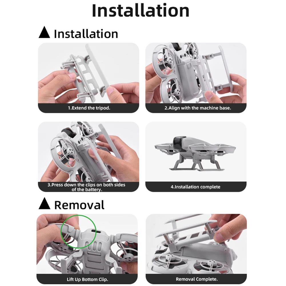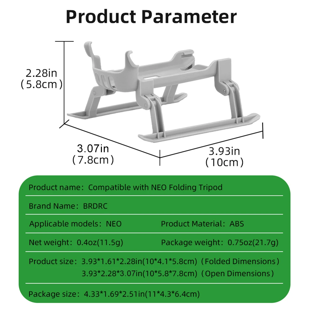 1. Enhanced Elevation: The heightened landing gear effectively elevates the drone by 25mm, specifically designed to protect the drone's camera and body from dirt and scratches. This ensures your drone remains in optimal condition across various environments. Specification: Origin: Mainland China Color: Gray Material: ABS Applicable models: Compatible with DJI Neo Product size: Unfolded size: 100x78x58mm/3.94x3.07x2.28inch Folded size: 100x58x41mm/3.94x2.28x1.61inch